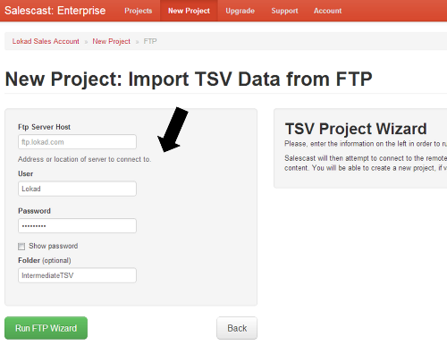 The ‘New Project’ tab in Salescast gives access to the FTP Wizard