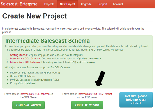 1. The ‘New projects’ tab in Salescast now offers a choice between the SQL Wizard and the FTP Wizard.
