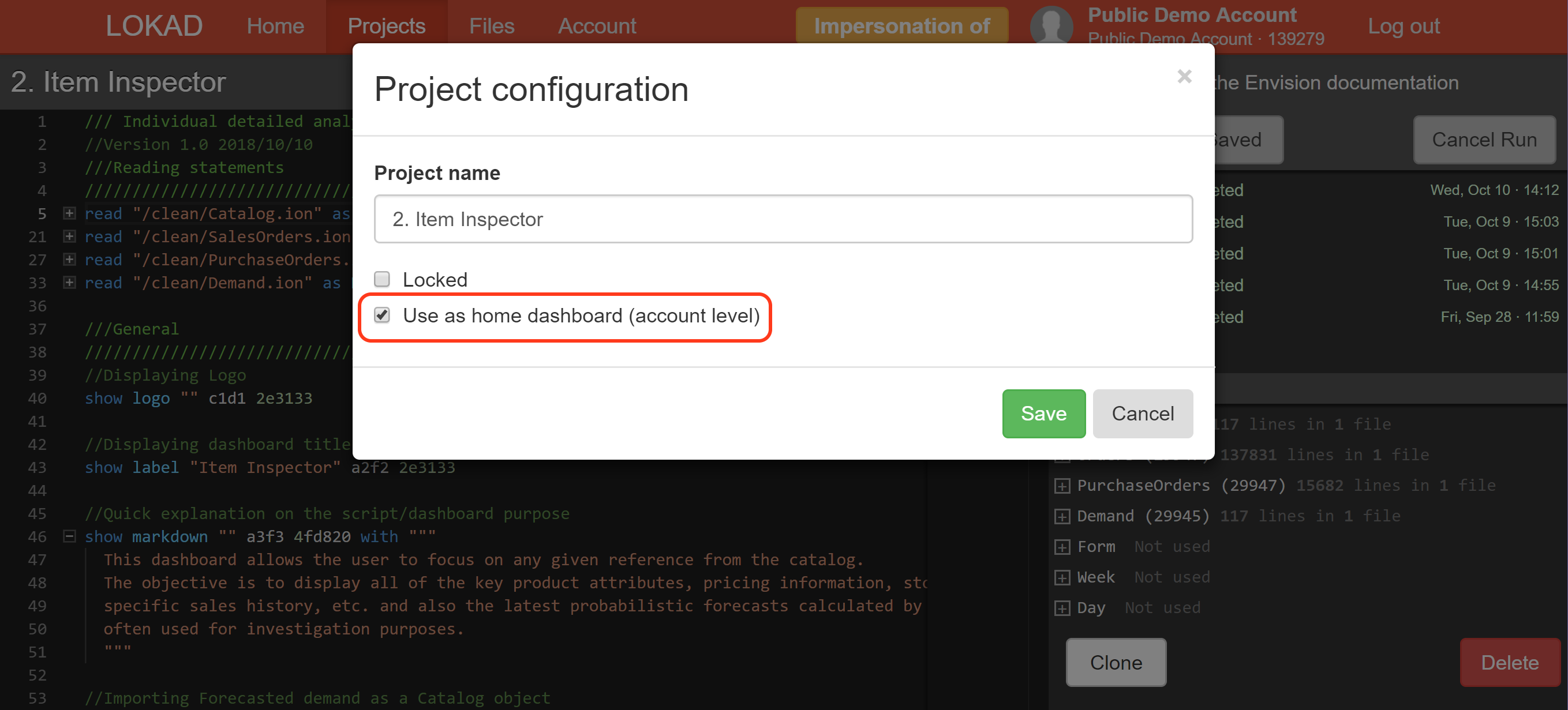 La fonctionnalité tableau de bord d’accueil vous permet de sélectionner un tableau de bord - généré via un script Envision - qui devient la “page d’accueil” de votre compte Lokad. Tout collègue ayant accès au compte Lokad sera redirigé vers le tableau de bord d’accueil après s’être connecté. La configuration d’un tableau de bord existant pour devenir le tableau de bord d’accueil peut se faire en cochant l’option Use as home dashboard comme illustré ci-dessous.