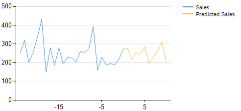 D’altra parte, le regressioni tipicamente producono curve. L’illustrazione qui sotto sta considerando una time-series che rappresenta le vendite storiche, e mostra la corrispondente previsione.