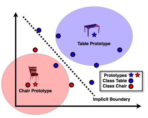 La classificazione tenta di separare (o classificare) gli oggetti in base alle loro proprietà. L’illustrazione qui sotto di Tomasz Malisiewicz illustra un compito di classificazione che cerca di separare immagini raffiguranti una sedia da immagini raffiguranti un tavolo.